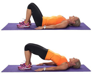 How to do it: Lie face up with your arms out to your sides, knees bent, and your toes off the ground. Squeeze your glutes (butt muscles) and thrust your hips upward until your body is in a straight line from your shoulders to your knees.