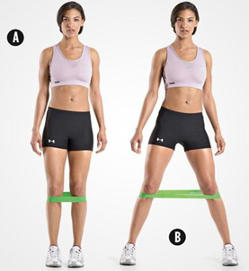 How to do it: Place a mini-band around your legs above the knee and another around your ankles. Walk forward in small steeps, keeping your knees bent and alternating the elbows driving back with each step. Keep your back straight and your knees over your toes at all times.