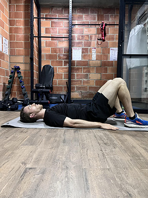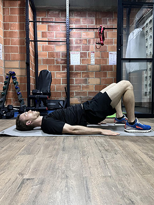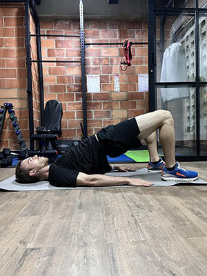 - Flex your glutes and lift your pelvis until your chest and legs are in one line
