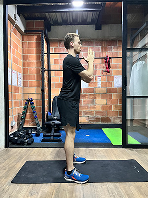 - Pushing through your heels, stand up. Repeat 8-12 reps