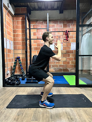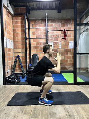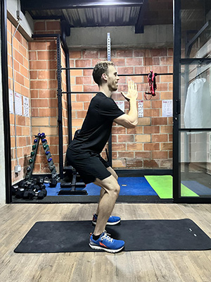 Some of the following exercises may look like the very motions that make your knees hurt. Work with your physical therapist, coach, or physician before beginning your knee health journey to find your starting point. Regressions (increasing ease) and progressions (increasing difficulty) means adapting the exercises to your current level. This could mean adjusting the depth of the motion or using a tool to balance. Pain outside of the norm during any exercise is a sign to stop and reevaluate. No pain no gain does not apply here!