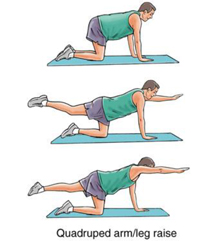 Get down on your hands and knees. Tighten your abdominal muscles to stiffen your spine. While keeping your abdominals tight, raise one arm and the opposite leg away from you. Hold this position for 5 seconds. Lower your arm and leg slowly and alternate sides. Do this 10 times on each side.