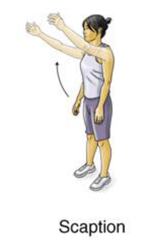 Stand with your arms at your sides and with your elbows straight. Slowly raise your arms to eye level. As you raise your arms, they should be spread apart so that they are only slightly in front of your body (at about a 30 degree angle to the front of your body). Point your thumbs toward the ceiling. Hold for 2 seconds and lower your arms slowly. Do 3 sets of 10. Hold a soup can or light weight when doing the exercise and increase the weight as the exercise gets easier.