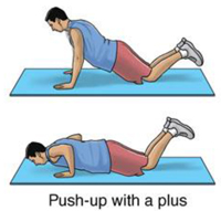 Begin on the floor on your hands and knees. Keep your arms a shoulder width apart and lift your feet off the floor. Arch your back as high as possible and round your shoulders (this is the “plus” part or the exercise). Bend your elbows and lower your body to the floor. Return to the starting position and arch your back again. Do 3 sets of 10.