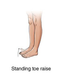 Balance yourself while standing behind a chair or counter. Using the chair to help you, raise your body up onto your toes and hold for 5 seconds. Then slowly lower yourself down without holding onto the chair. Hold onto the chair or counter if you need to. When this exercise becomes less painful, try lowering on one leg only. Repeat 10 times. Do 3 sets of 10.