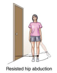 Stand sideways near a doorway. Tie elastic tubing around the ankle on your leg which is away from the door. Knot the other end of the tubing and close the knot in the door. Extend your leg out to the side, keeping your knee straight. Return to the starting position. Do 3 sets of 10.