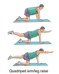Get down on your hands and knees. Tighten your abdominal muscles to stiffen your spine. While keeping your abdominals tight, raise one arm and the opposite leg away from you. Hold this position for 5 seconds. Lower your arm and leg slowly and alternate sides. Do this 10 times on each side.