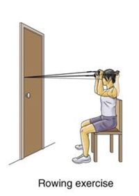 Tie a piece of elastic tubing around an immovable object and grasp the ends in each hand. Keep your forearms vertical and your elbows at shoulder level and bent to 90 degrees. Pull backward on the band and squeeze your shoulder blades together. Repeat 10 times. Do 3 sets.